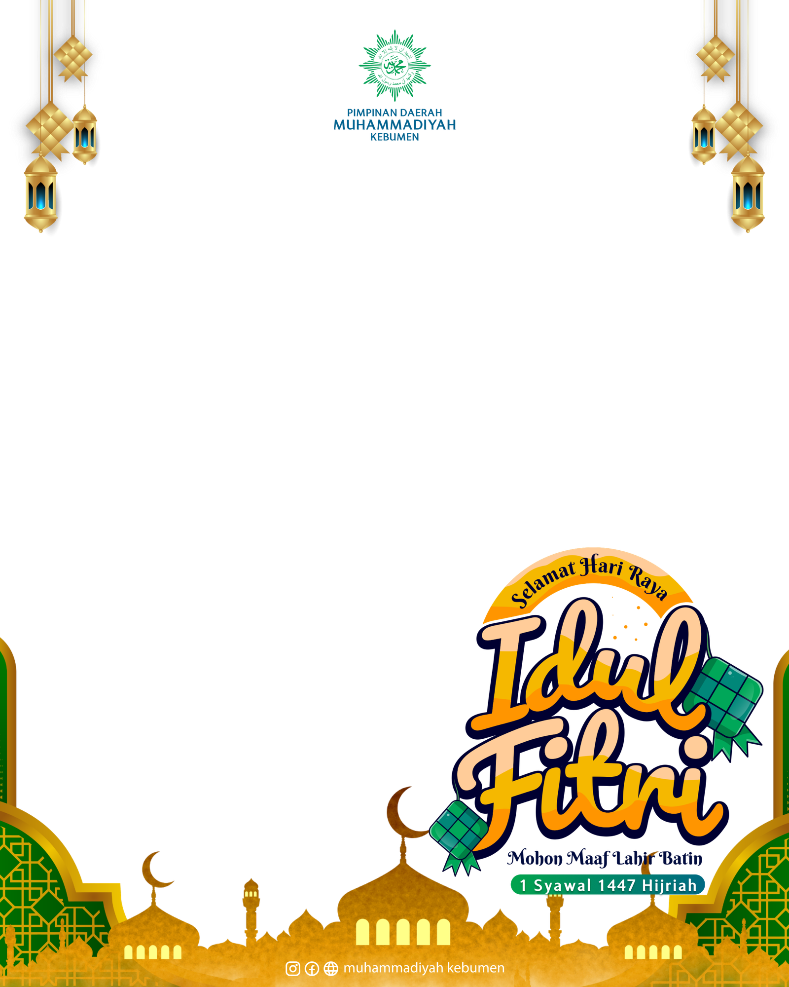 Rayakan hari kemenangan dengan penuh kebahagiaan. Gunakan twibbon ini untuk menyampaikan ucapan Selamat Hari Raya Idul Fitri 1447 Hijriah dari keluarga besar Pimpinan Daerah Muhammadiyah di Kebumen.